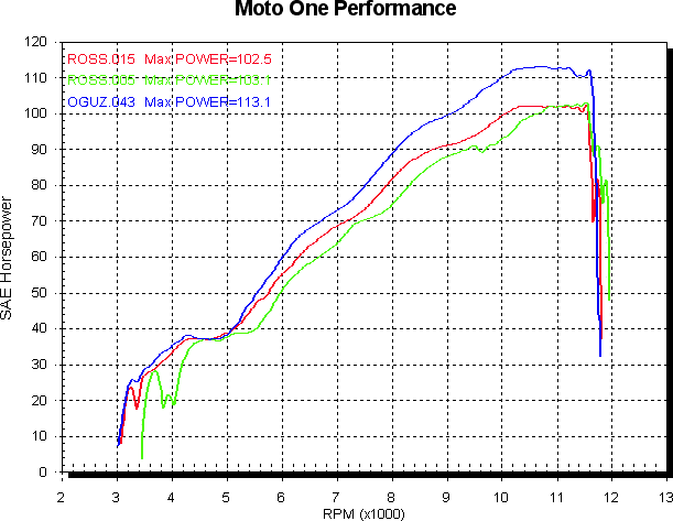 The final graphs compare output to the 748Strada with cams dialed and 45/50mm half exhaust. Red is the un-ported 748R, blue the ported 748R and green the 748Strada. The red and green curves are pretty much equal up to 9,500 RPM, at which point the Strada torque curve continues to fall away steadily, and the R torque curve plateaus for another near 1, 000 RPM, which is where the extra power comes from. Power first, then torque. The 5,000 RPM hole is consistant, if nothing else. The ported bike just whips them both.