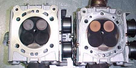 749 With 924 Big Bore Kit (base model 749 engine) - Written Feb ‘06 A fairly simple mod, this involves fitting 999 100mm bore cylinders and specific pistons to a 749, giving 924cc, a 23.5% increase. The 749 and 999 shares the same cylinder stud spacing (along with the 1000DS, ST3 and 996) so the cylinders go straight in. The std 749 cylinders can’t be bored to 100mm though they have a reduced OD at the bottom of the spigot and can only go to 95mm from memory, which gives 834, an 11.5% increase. The specific pistons are required as they need to be half the stroke difference longer in the compression height the distance from the centre of the pin to the crown. As the 749 is 58.8mm stroke and the 999 63.5mm the pistons are (63.5 58.8)/2 = 2.35mm taller. I’m told the 749R has the same pistons as the 999, being the only 4V model ever to have a unique rod all it’s own (2.35 or so mm longer) so you can just use std 999 pistons and cylinders to get 848 out of one of them. We used a kit from BCM Ducati, comprising some lovely Pistal pistons and some 999 cylinders. Bruce also modified a couple of 999 head gaskets for me, just to show me what he did instead of trying to explain it. Much easier, and I’ll know for next time. There is a bit of other work needed too the 749 and 999 heads and cylinders have different water jacket castings. Sounds bizarre, but they are quite different. I don’t understand why. The photo below shows the differences. 749 base model head on the left, 999S head on the right.