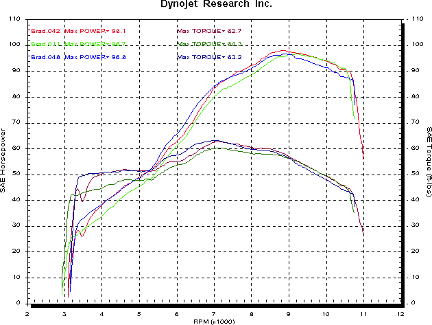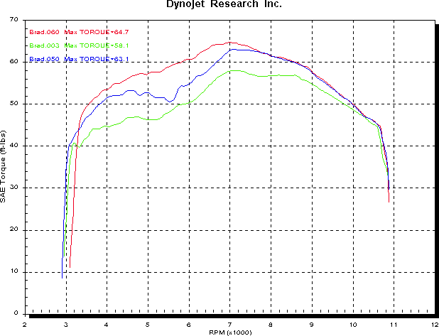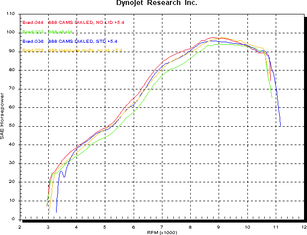 The three curves shown are all std in green, the final cams dialed, open airbox lid, Megacycle mufflers and fuel rezoning in red, and the final without any fuel mods ie, running a std chip in blue. The problem is rather obvious.