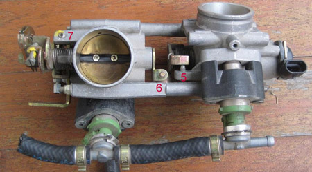 Items viewed from top, mainly to show the location of the RH throttle stop screw. 5 and 6 are shown again from this angle.