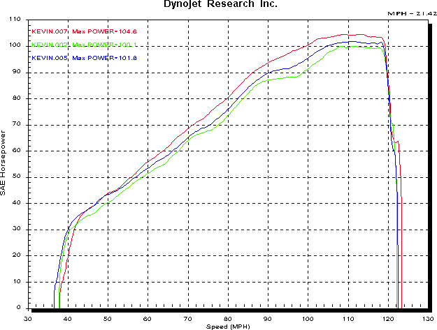 Anyway, getting back to the story. I got the chance to dyno one of these bikes when it came in for some STAINTUNE mufflers. Given I wasnt riding at this stage (another broken leg fixing operation), I drove to the dyno in the shop ute with the mufflers in the back. This let me do a direct before/after test. I added to that a test with the STAINTUNES fitted and the airbox lid removed. What this does to the mixture Im really not sure, although I would have to assume it would put it into the lean area. Cant say I would recommend riding it like that. The dyno curves are shown below. Removing the airbox lid certainly makes a difference, as the red curve shows. Staintune only is blue, standard is green. How much better it would be with a suitable map in the ECU will be for the future to tell. The shape of the curve is consistent through all three though, which is most likely attributable to the cam timing.