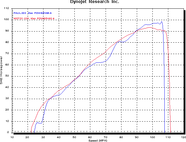 The graph below compares one of our customers bikes fitted with the VANDERLINDE exhaust and chip ( blue ) with my R1100S fitted with the STAINTUNE and FIM chip ( red ). The bottom scale is road speed only, which may not be entirely accurate in a comparison sense. The road speed to engine rev relationship depends on the rear tyre type, size and wear, and the bikes position on the dyno roller. If we move one of the graphs either left or right, even just a little, the comparison can change markedly.
