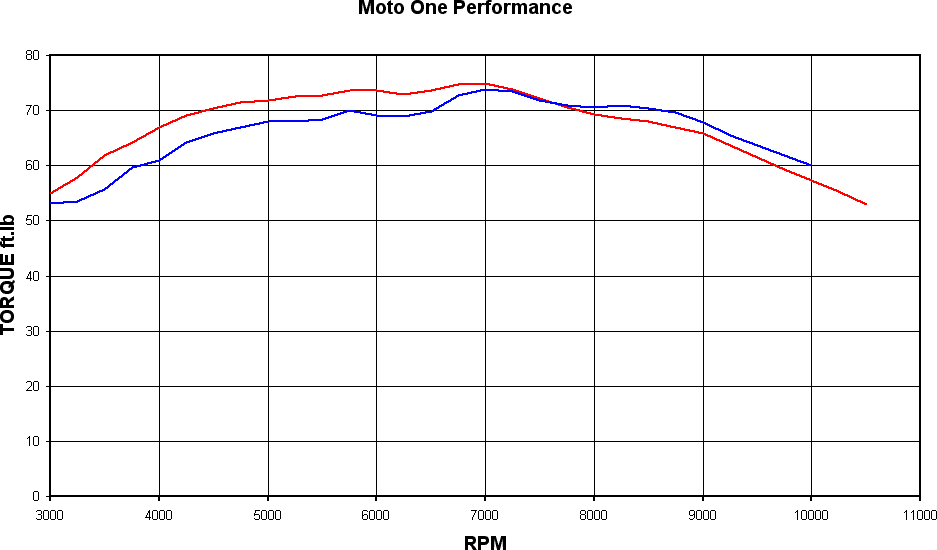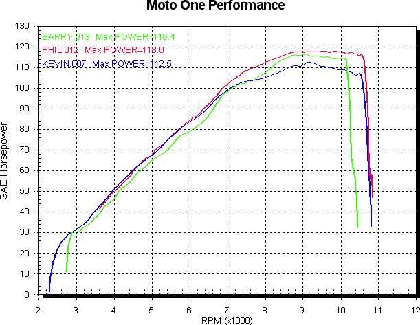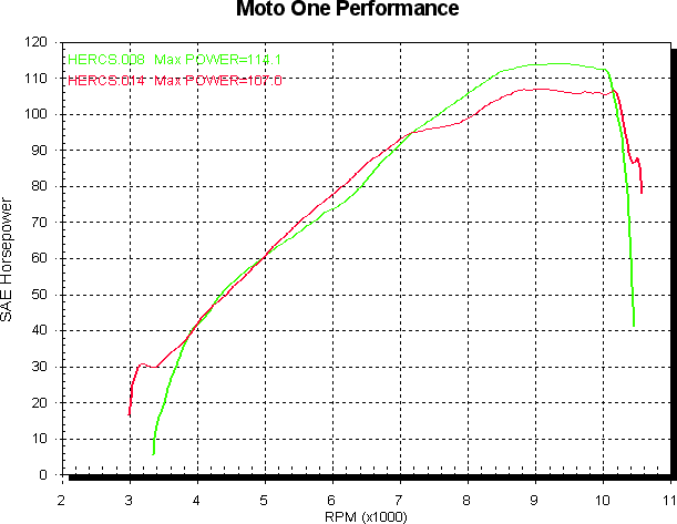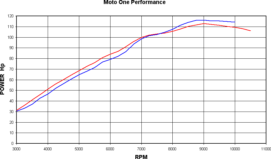 The power curve below shows the red bike going off to some extent around 7,500 RPM, whereas the blue bike doesn’t go off until 9,000 RPM.