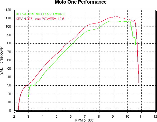 This bike had a DP power kit with the mufflers either side. Otherwise it was as delivered. Green is with the std catalytic convertor, red is with the cat replacement pipe. You can see the top end loss that comes from a non flowing x-over.