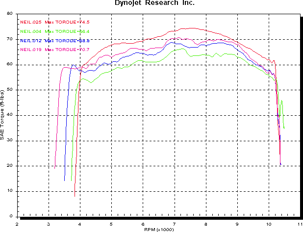 The graph for DP mufflers with air filter kit is next. Trimmer set to +10 is green, +20 is blue, +30 is yellow, and +40 is red. As you can see, not that much variation between the air/fuel curves for the four settings. The purple run is with the DP ECU added. The difference in both air/fuel and performance is very obvious. The trimmer is set to +20 for this run, although it ended up at +35 when I got back to work and set the idle mixture to 4% CO using the gas analyser. So, it would have been a little richer again than this curve shows.